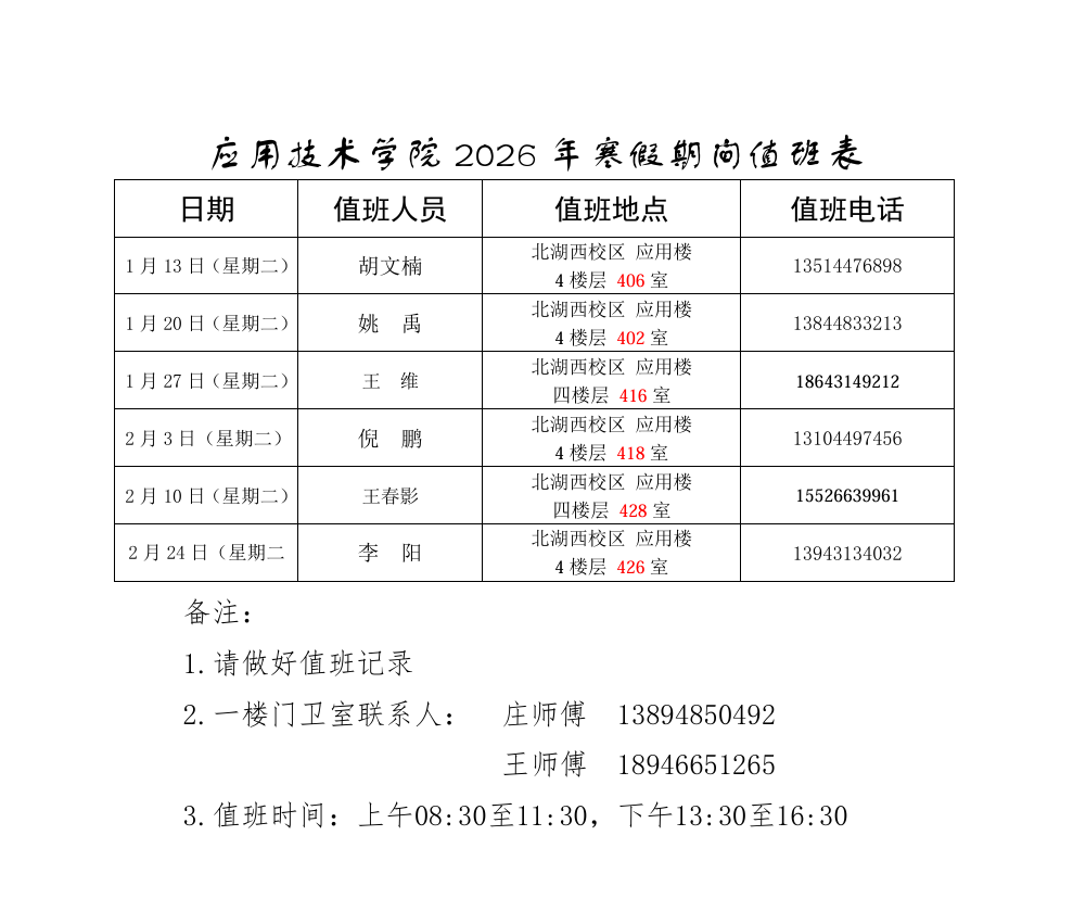 应用技术学院2026年寒假期间值班表